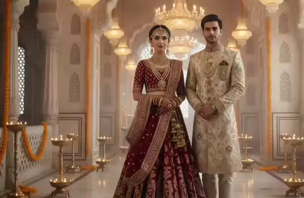 A couple dressed in royal Indian attire, woman in an embroidered lehenga with gold jewelry, man in an elegant sherwani, standing in a grand palace hall lit with chandeliers and diyas.
