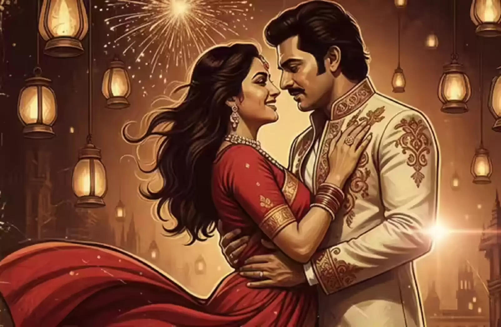 A couple posed dramatically like a 1970s Bollywood movie poster, woman in a flowing saree, man in a sherwani, warm sepia tones, fireworks in the background, and expressive emotions of love and joy.