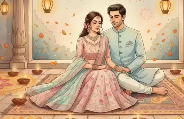 A couple seated gracefully in a courtyard, wearing pastel-toned traditional outfits, surrounded by ornate rangoli designs, with soft background fireworks, and warm ambient lighting in watercolor style.